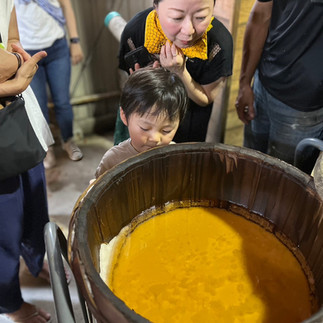 それを次に1000L(1トン)入る、石造りの窯に移し、丁寧に表面に浮いてくるアクを除きながら温めます。