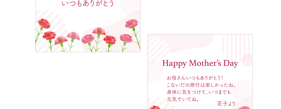 ・母の日用メッセージカードを添えてお送りいたします。定型文は「 いつもありがとう」です。オリジナルメッセージをご希望の方は、備考欄にメッセージの内容をご入力ください。
